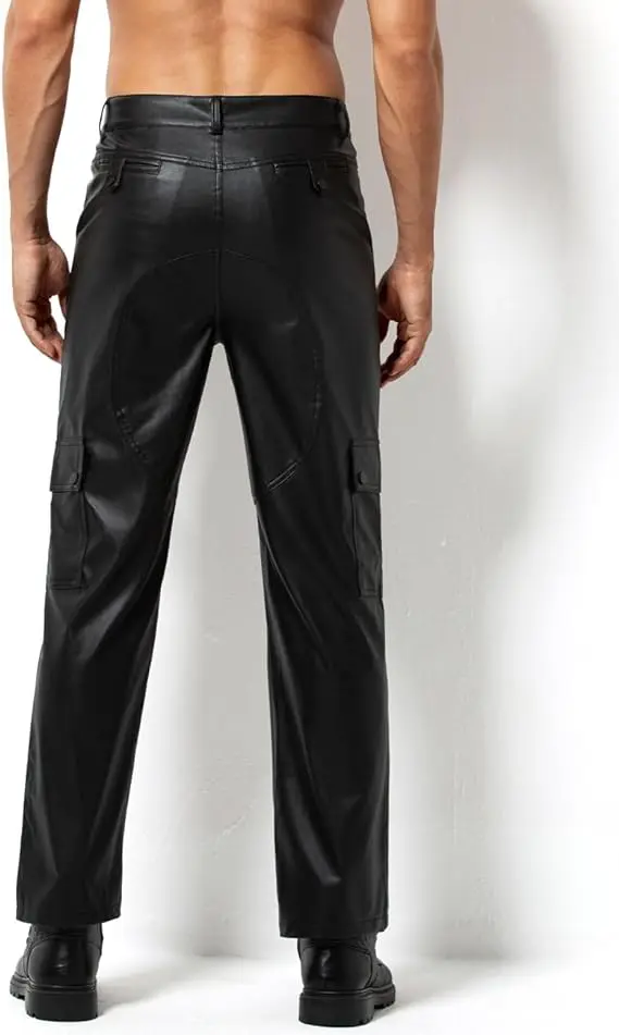 Arjen Kroos Men's Leather Pants Casual Straight Leg Motorcycle PU Leather Pant Multi Pockets