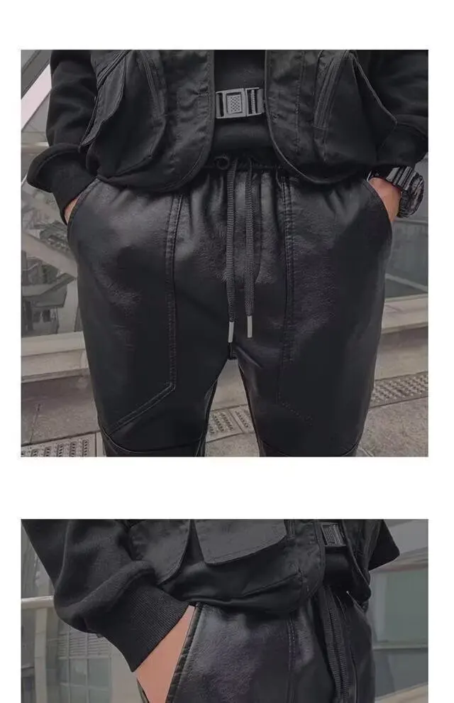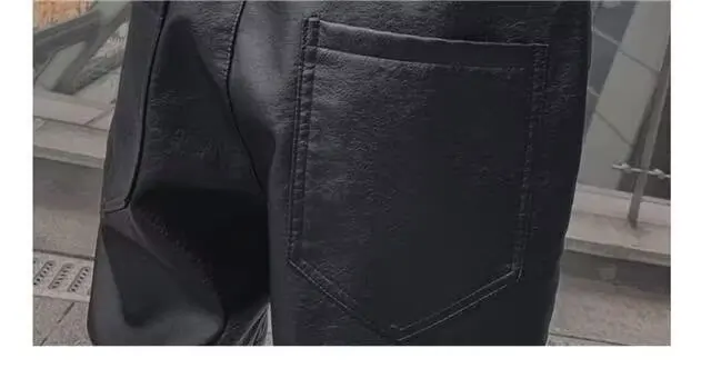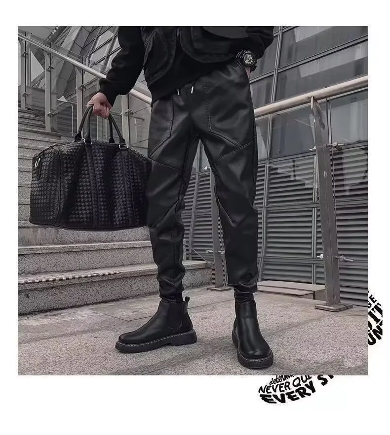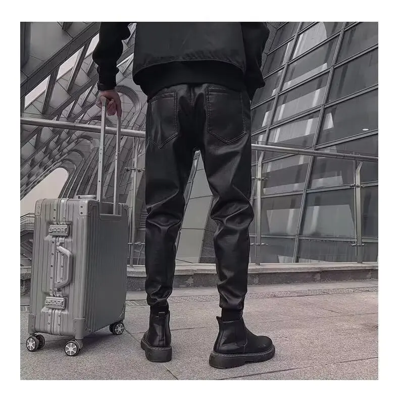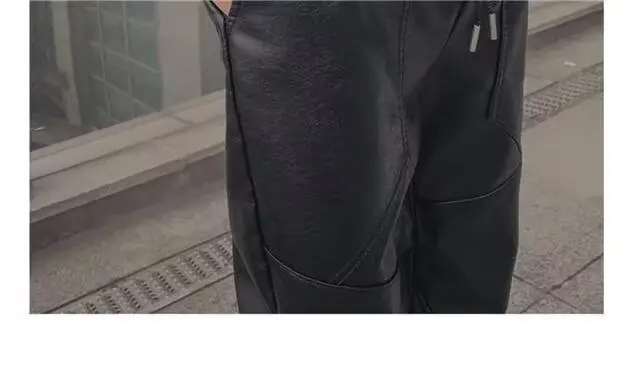 Men's Fleece-Lined Warm Leather Pants for Autumn/Winter - Trendy Pure Black Windproof Thickened Casual Long Trousers for Food De